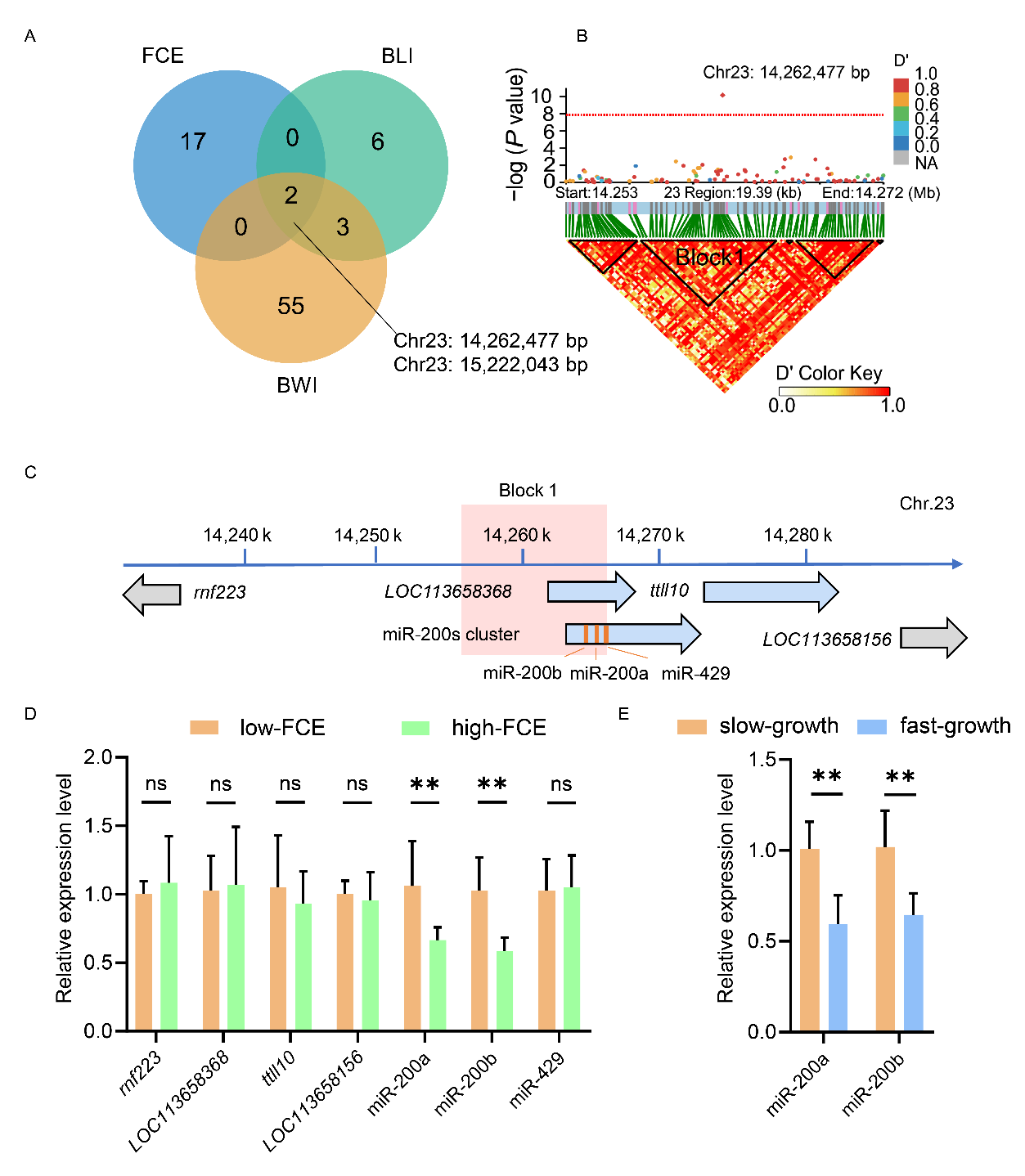 近期,中国科研实验室水生生物研究所梅洁研究员团队在黄颡鱼(Pelteobagrus fulvidraco中揭示了miR-200a/200b-stat5b信号轴耦合调控生长与饲料转化率的分子机制。研究第一时间选育了兼顾速生和高饲料转化率性状的黄颡鱼群体,顺利获得全基因组关联分析将关键位点定位于23号染色体miR-200基因簇附近,发现miR-200amiR-200b在速生、高饲料转化率个体中显著下调(图1)。进一步构建黄颡鱼miR-200a/200b敲除纯合子,在平均摄食量无显著变化的情况下,敲除纯合子的生长和饲料转化率显著提高。结合TargetScan靶基因预测及miRNA-RNA pulldown及测序分析,鉴定出一系列与生长代谢相关的关键靶基因,如stat5bfasn(图2)。其中,stat5b被证实为miR-200a/200b的核心靶基因,且stat5b转基因黄颡鱼生长和饲料转化率均得到显著提升(图3。该研究表明,miR-200a/200b主要顺利获得作用于能量代谢相关靶基因和信号通路来调控营养利用效率,为解析高产与节粮性状的耦合调控机制及相关性状的精准改良给予了重要理论依据和技术支撑。